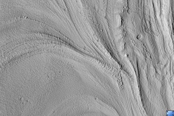 This HiRISE image (PSP_002922_1725) shows glacier-like flow in a depression in the flanks of Arsia Mons.