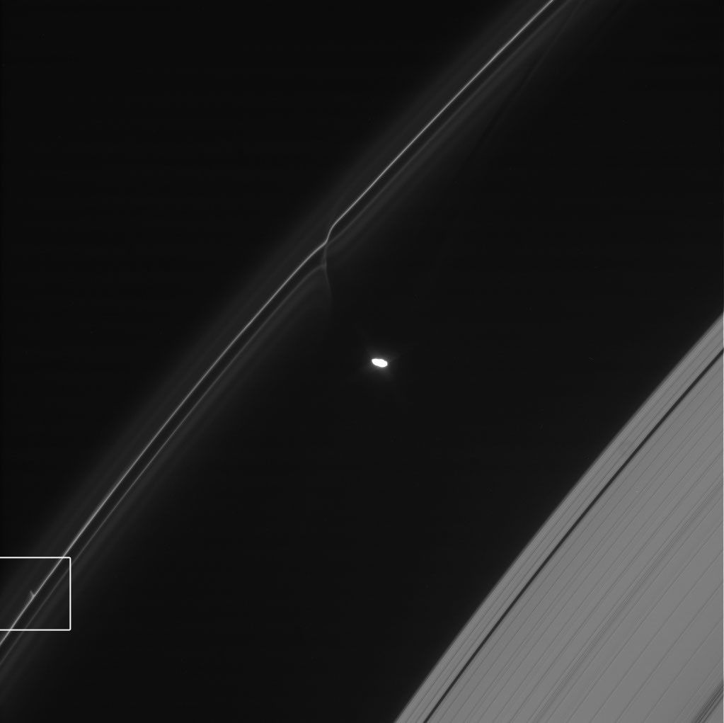 The trail, made of icy particles dragged out of Saturn's F ring, is highlighted in a box that starts at the bottom left. When it first appears, it is about 47 miles (75 kilometers) long. By the end of the sequence, it has stretched to about 155 miles (250 kilometers) long. The object that created the trail is about a half mile (1 kilometer) in diameter. The F ring has a radius of about 87,129 miles (140,220 kilometers).