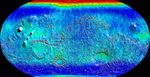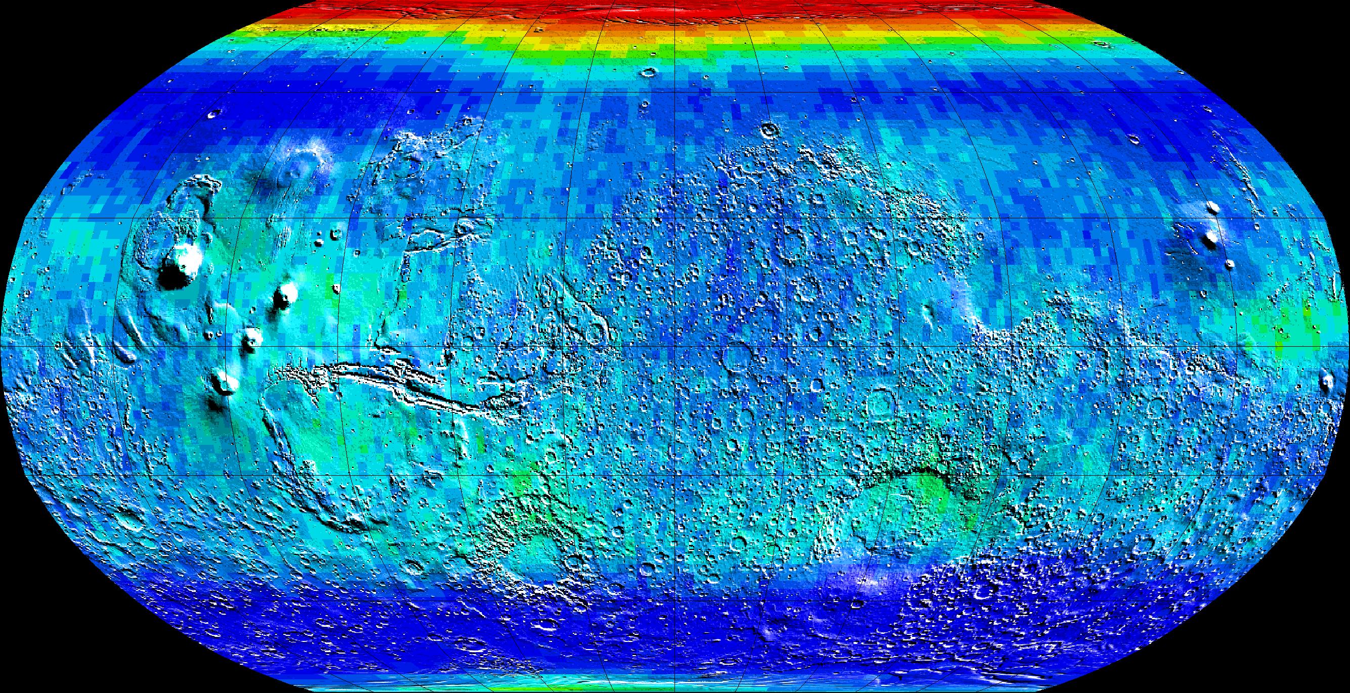 Observations by NASA's 2001 Mars Odyssey spacecraft show a global view of Mars in low energy, or thermal, neutrons. Thermal neutrons are sensitive to the presence of hydrogen and the presence of carbon dioxide, in this case "dry ice" frost. The red area at the top of the map indicates that about one meter (three feet) of carbon dioxide frost covers the surface, as it does every Mars winter in the polar regions. Soil enriched by hydrogen is indicated by the deep blue colors on the map, which show a low intensity of thermal neutrons. An enhancement of thermal neutrons close to the south pole, seen as a light green color, indicates the presence of residual carbon dioxide in the south polar cap, even though the annual frost dissipated from that region during southern summer.