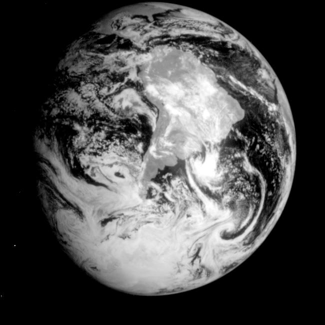 This near-infrared photograph of the Earth was taken by the Galileo spacecraft at 6:07 a.m. PST on Dec. 11, 1990, at a range of about 1.32 million miles. The camera used light with a wavelength of 1 micron, which easily penetrates atmospheric hazes and enhances the brightness of land surfaces. South America is prominent near the center; at the top, the East Coast of the United States, including Florida, is visible. The West Coast of Africa is visible on the horizon at right.