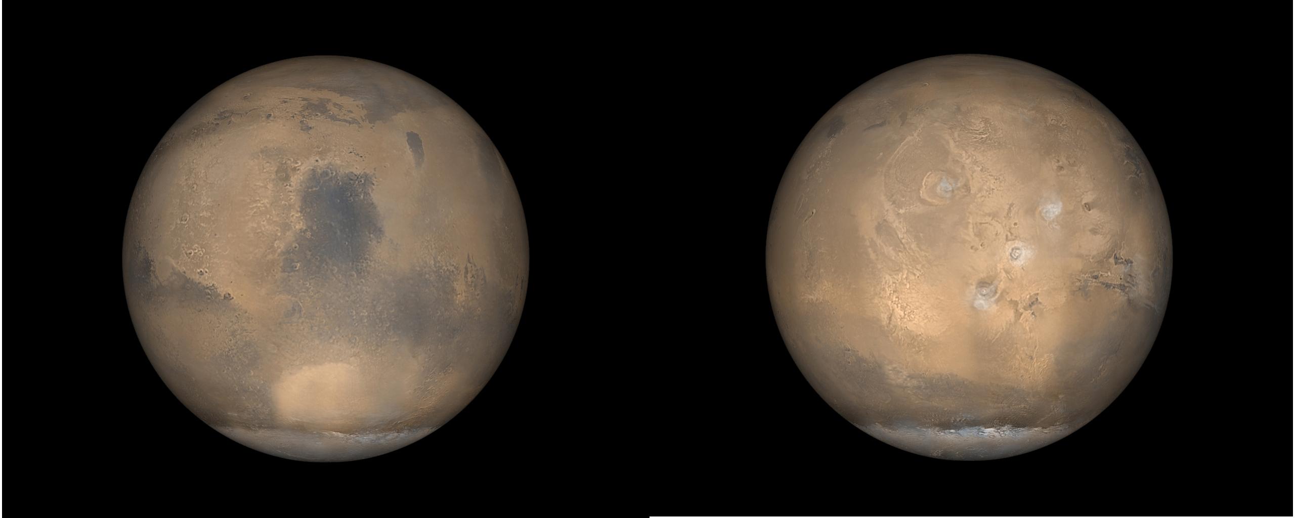 Mars Global Surveyor (MGS) orbits around the red planet 12 times a day. Each orbit goes from pole to pole. Over the course of a single day, the wide angle cameras of the Mars Orbiter Camera (MOC) system take 24 pictures--12 red and 12 blue--that are assembled to create a daily global map. Such global views are used to monitor the martian weather and observe changes in the patterns of frost and dust distribution on the surface. These two pictures are examples of what Mars looks like in late northern summer, which is also late southern winter. At this time of year, the south polar cap (bottom, white feature in each image) is very large, extending from the south pole northward to 60°S. Also at this time of year, clouds of water ice crystals are common over the four largest volcanoes in Tharsis. The picture on the right shows Tharsis, with the four volcanoes forming a triangle resembling the pattern of holes on a bowling ball. The image on the left is centered on Syrtis Major, a dark, windswept volcanic plain so large that it has been known to science since the first telescopes were turned toward Mars in the 1600s. The elliptical bright feature at lower-center in the left image is the Hellas Basin, the largest unequivocal impact basin (formed by an asteroid or comet) on the planet. Hellas is approximately 2200 km (1,370 mi) across.