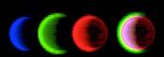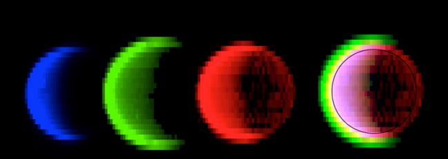 The multicolor image on the far right combines the three previous images into one composite. Here it is seen that the carbon monoxide glow extends over the dayside as well, producing the yellow layer observed on the left. This is because the two glows, one from methane (green) and carbon monoxide (red) mix together to form yellow in this multi-color composite. Titan's surface is indicated by the circle. Titan's surface appears purple due to the mixing of the blue and red surface images.