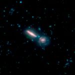 This image shows two merging galaxies known as Arp 302, also called VV 340. It is composed of images from three Spitzer Infrared Array Camera (IRAC) channels: IRAC channel 1 in blue, IRAC channel 2 in green and IRAC channel 3 in red.