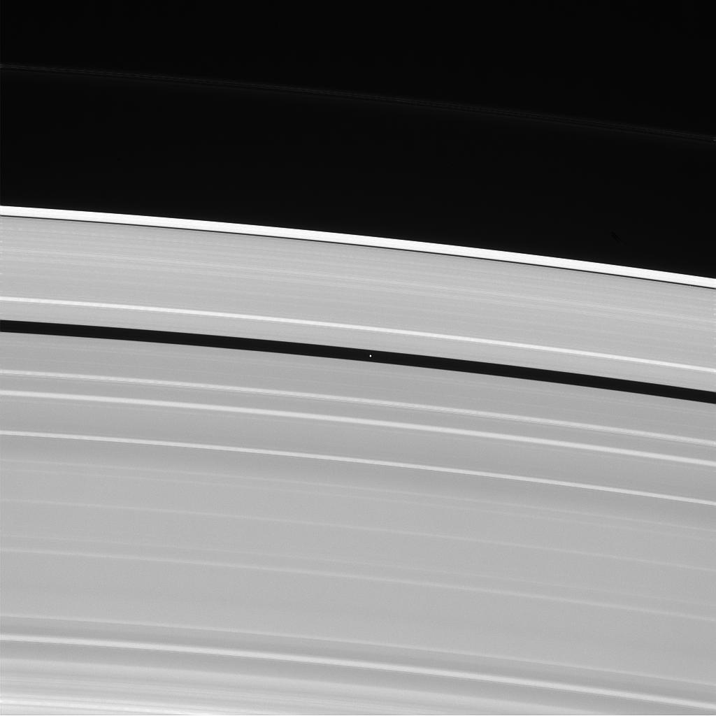 Pan (17 miles, or 28 kilometers across) keeps the Encke gap open through its gravitational influence on the ring particles nearby.