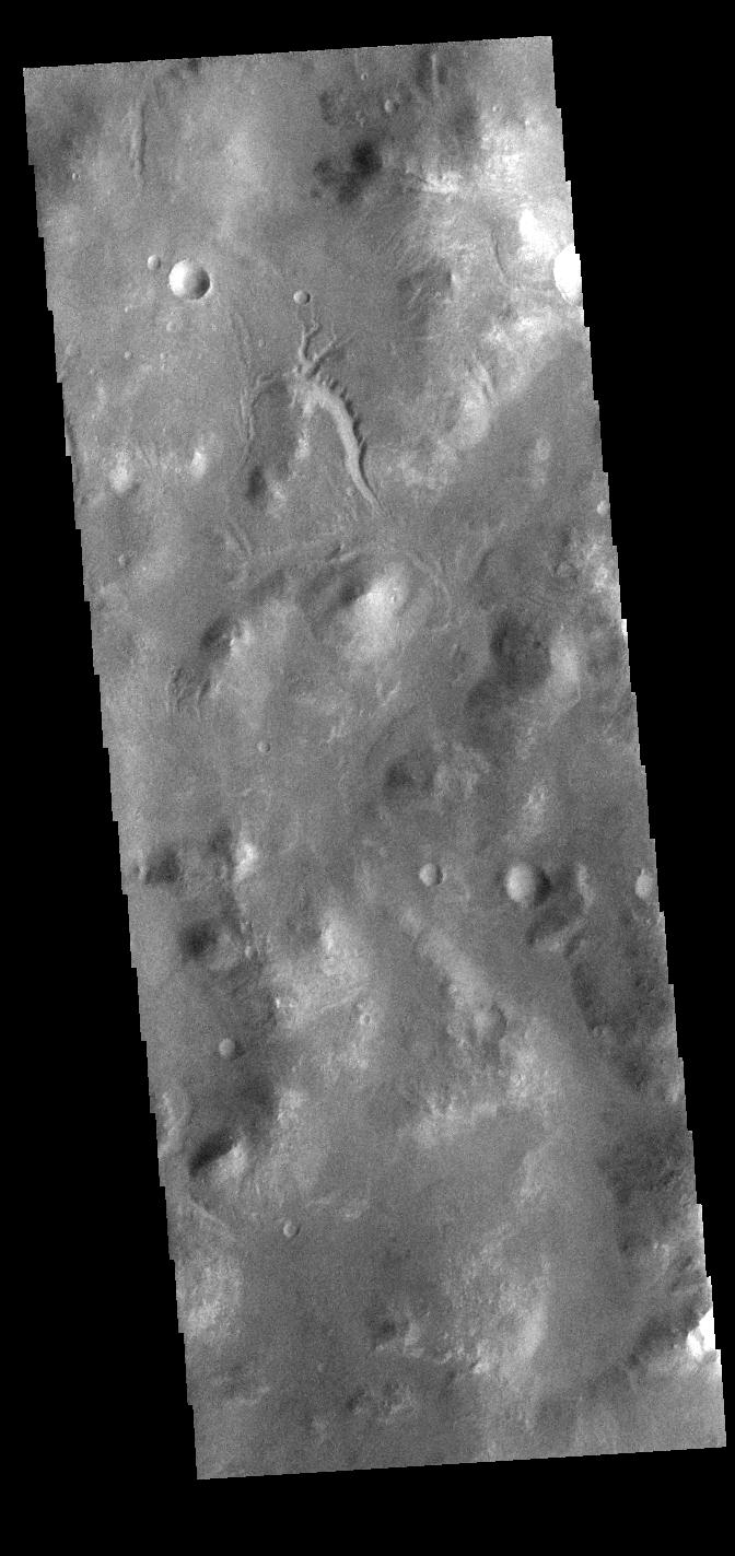 Today's VIS image shows a small channel located west of Holden Crater in Noachis Terra. The channel appears to arise from and flow to – well, nowhere. Small channel systems like this occur all over the surface of Mars. It was likely formed during the 'wet' period of Mars' history, when surface flows carved the large channels on Mars, but also lots of little channel just like this one.