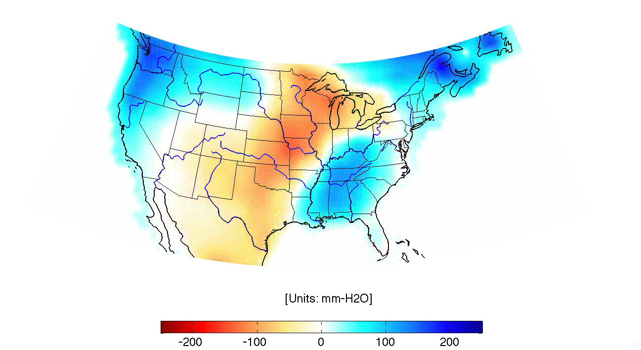Seasonal variations in land water storage are dominant in the animation. When it rains or snows, land water storage increases (blue colors). In most areas, this typically happens in the winter and spring time. During the summer months, water storages decreases as water evaporates, is routed through rivers to the ocean, or is used for irrigation and consumption (red colors). This seasonal cycle repeats every year, but varies in amplitude. For example, in the spring of 2011, above-average rain and snowfall caused severe flooding in much of the upper Mississippi and Missouri rivers (dark blue). In contrast, much of the United States was affected by drought conditions in the late summer of 2012 (dark red), following below-average winter precipitation and above average temperatures.