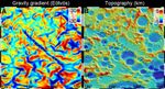 A 300-mile-long (500 kilometer-long) linear gravity anomaly on the far side of the moon has been revealed by gravity gradients measured by NASA's GRAIL mission. GRAIL data are shown on the left, with red and blue corresponding to stronger gravity gradients. Topography data from NASA's Lunar Reconnaissance Orbiter's Lunar Orbiter Laser Altimeter for the same region show a surface saturated with craters (red is higher terrain and blue is lower). The lack of any topographic signature over the gravity anomaly indicates that it is older than the craters, and thus is one of the oldest features on the moon.