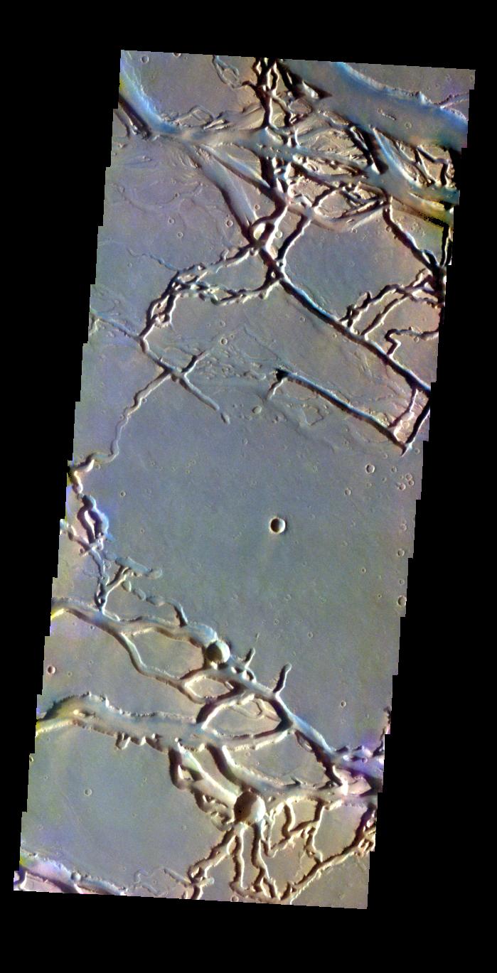 The THEMIS VIS camera contains 5 filters. The data from different filters can be combined in multiple ways to create a false color image. These false color images may reveal subtle variations of the surface not easily identified in a single band image. Today's false color image shows part of Granicus Valles.