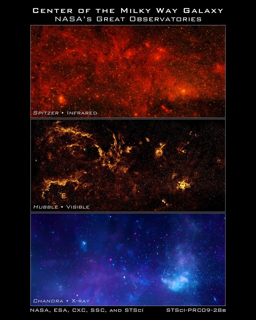 In celebration of the International Year of Astronomy 2009, NASA's Great Observatories -- the Hubble Space Telescope, the Spitzer Space Telescope, and the Chandra X-ray Observatory -- have produced a matched trio of images of the central region of our Milky Way galaxy. Each image shows the telescope's different wavelength view of the galactic center region, illustrating the unique science each observatory conducts.