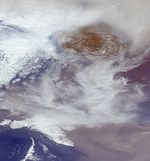 The second image (Figure 1), consisting of two panels, shows the more traditional nadir (vertically-oriented) camera view of the eruption at left, and a stereoscopic height analysis at right, generated by processing data from multiple MISR camera angles. The color scale shows the derived heights. This analysis places the maximum height of the plume at the time of overpass at about 46,000 feet (14 kilometers), which means that the ash has been injected into the stratosphere, the stratified portion of Earth's upper atmosphere. On this date, atmospheric soundings indicated that the boundary between the lower atmosphere, known as the troposphere, and the stratosphere was at an altitude of about 30,000 feet (9 kilometers).The neighboring wispy cirrus clouds that are visible in the scene occur at roughly this altitude. Near the lower right portion of the image, a diffuse ash cloud is also visible, with heights much closer to the surface.