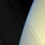 The Cassini spacecraft peers through Saturn's delicate, translucent inner C ring to see the diffuse blue limb of Saturn's atmosphere.