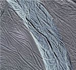 Both visible-light and SAR images show the shape of features and give information about the features' composition. But whereas visible-light images (like we normally see in photographs) tell us about chemical composition, SAR images tell us about electric properties. Electric properties help us distinguish one material from another. Here, shadowing in this SAR imagery also emphasizes smaller undulations in the surface interspersed in the terrain surrounding the large groove. These appear to be relatively young features that may have formed from extension, or pulling apart, of Enceladus' crust due to effects of Saturn's gravity. Since the radar illumination is from the upper right (perpendicular to the swath), the upper slopes of grooves are dark and the lower (left) slopes are bright. Analysis of the slopes and their shading reveal that the central, prominent groove is about 2,100 feet (650 meters) deep and 1.2 miles (2 kilometers) wide, with slopes of about 33 degrees.