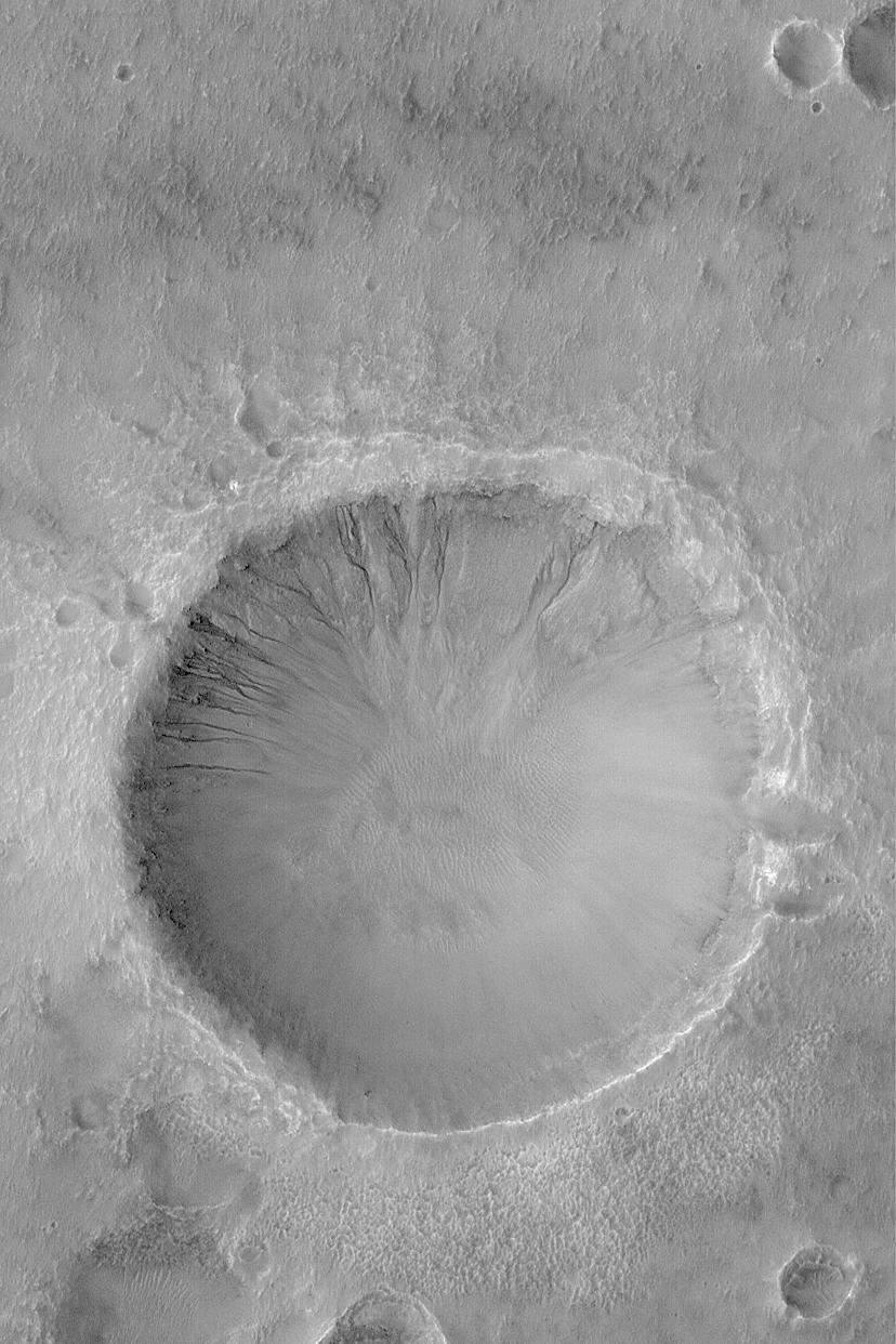 Many craters and troughs at middle latitudes on Mars have gullies carved into their slopes. These gullies often have banked or even meandering channels that indicate a fluid with the properties of water may have been involved. Indeed, it is possible that such gullies indicate places where liquid water seeped out to the martian surface, or formed from melting ice, in the not-too-distant past. This Mars Global Surveyor (MGS) Mars Orbiter Camera (MOC) image shows an example located in a crater in Terra Cimmeria near 37.7°S, 191.6°W. The picture was acquired only a few months ago in November 2003. Sunlight illuminates the scene from the left/upper left; the picture covers an area 3 km (1.9 mi) wide.