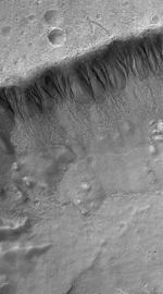 This Mars Global Surveyor (MGS) Mars Orbiter Camera (MOC) image shows a suite of south mid-latitude gullies on a crater wall. Gullies such as these may have formed by runoff of liquid water.
