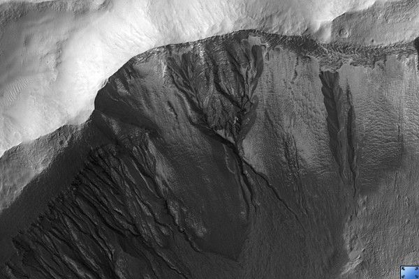The gullies seen in this image exhibit a range of morphologies. The large gully in the center of the image is deeply incised with a wide alcove. The gullies on the west (left) rim of the crater have small alcoves and tiny channels. Many of the channels appear to start at one of the fine layers that can be seen along this wall (see subimage, ~ 800 meters across). It is possible that water came from underground along these layers to form the gullies. The gully on the far left of the image extends all the way to the top of the slope. It is likely that the water that fed this gully came from one of the layers and then the slope experienced headward (upslope) erosion and collapse to extend the alcove to the crater rim.