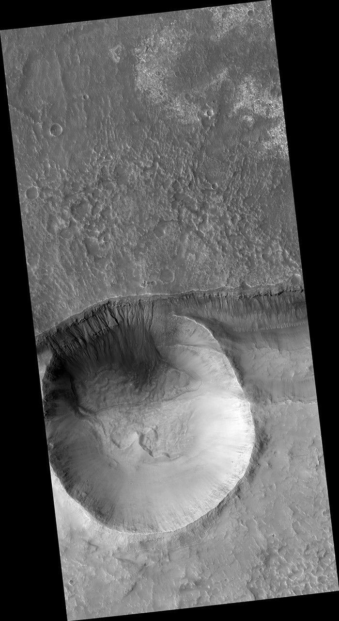 The topography here is also interesting. There are two main features, an impact crater and a long trough called a graben, formed when the surface drops down between two faults. The eastern side of the crater is clearly cut by faulting, distorting the circular shape. On the north side, the crater rim is below the top of the graben fault. The crater could have dropped into the trough as it formed, but it is also possible that the trough partially formed before the crater and continued to widen later.
