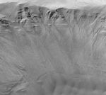 The gullies shown here occur on the layered north wall of a crater in Newton Basin near 41.8°S, 158.0°W. The picture was obtained by MOC in May 2002. Dark sand dunes are visible at the bottom of the image, especially at the lower right. This view has an aspect ratio of 1.5 to 1; that is, the image covers an area 4.3 km (2.7 mi) from top to bottom and 2.9 km (1.8 mi) from left to right. Nearly all of the craters in Newton Basin have a plethora of similar gullies, suggesting that Newton is the site of an aquifer. Instead of forming by seepage and runoff of groundwater, other researchers have suggested that martian gullies may form by melting of ground ice, melting of surficial snow (under climate conditions different than today), or discharge of carbon dioxide that somehow became buried under the martian surface. None of these alternatives can explain all of the observed attributes of the gullies, especially their associations with specific layers. Seeping water, potentially as a saline brine, remains the most likely explanation.
