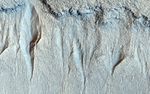 Here, we have a group of small gullies along a rock layer on the south wall of Liu Hsin Crater. At the foot of the gullies you can see the "fans" of granular sediment that have been deposited downhill from the gully formation.
