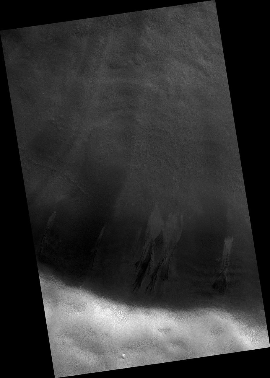 We acquire such images because gullies on Mars actively form in the winter when there is carbon dioxide frost on the ground, so we image them in the winter, even though not well illuminated, to look for signs of activity. The dark streaks might be signs of current activity, removing the frost, but further analysis is needed.