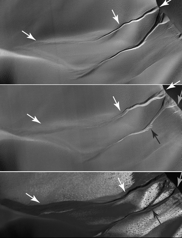Arrows indicate places where changes appeared between observations. Each year, the alcoves at the dune's crest and the channel beds widened during the Martian winter as material moved down slope and lengthened the apron at the bottom. Very new deposits (formed sometime in September 2010) are visible in the bottom image as the darker material extending from the channels and obscuring the pre-existing ripples on the dune's surface. Additionally, on the upper gully, material first filled-in part of the channel (between 2008 and 2009) and then re-incised the channel into the apron (between 2009 and 2010).