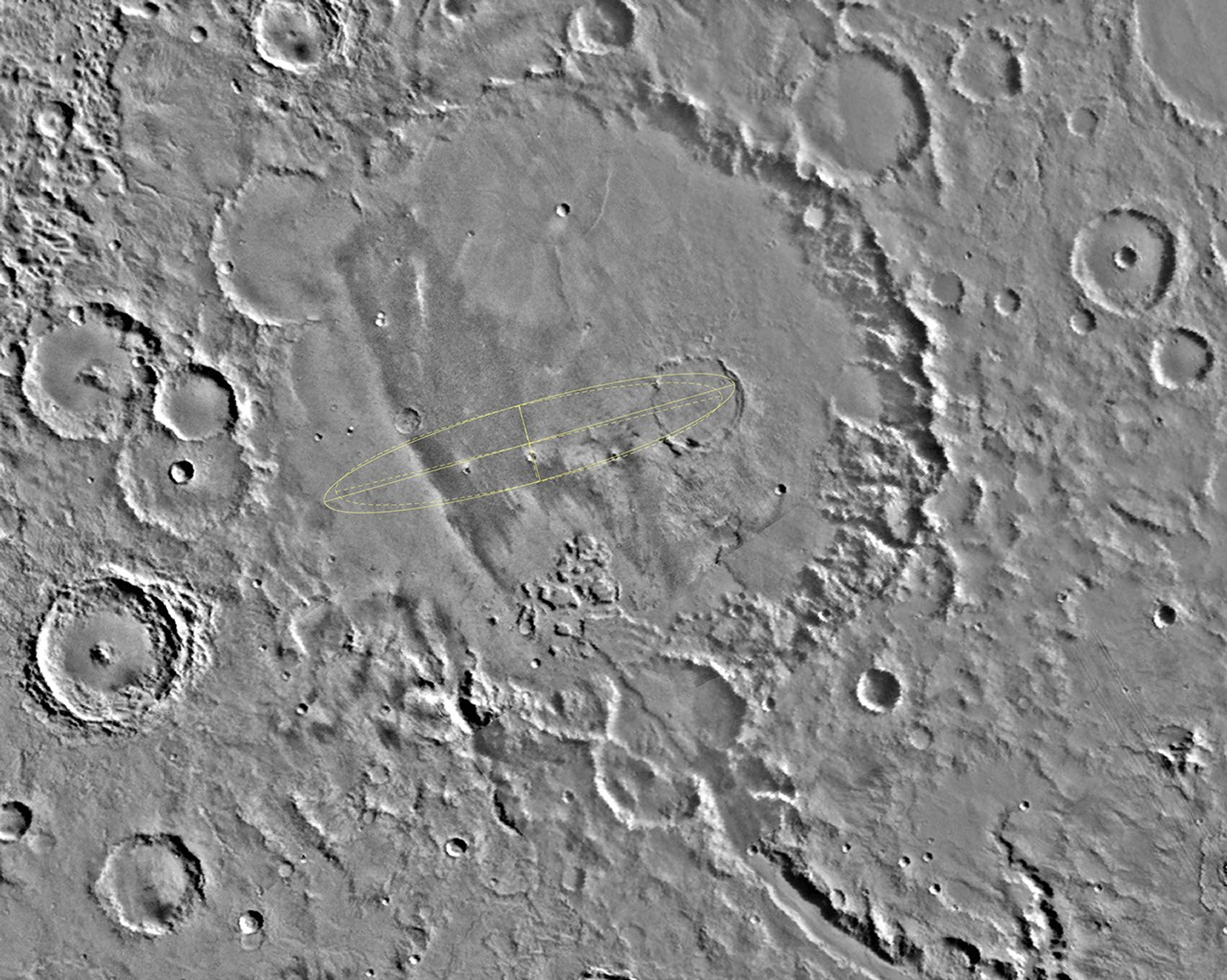 The designated landing site for the first Mars Exploration Rover mission is Gusev Crater, seen here in its geological context from NASA Viking images.