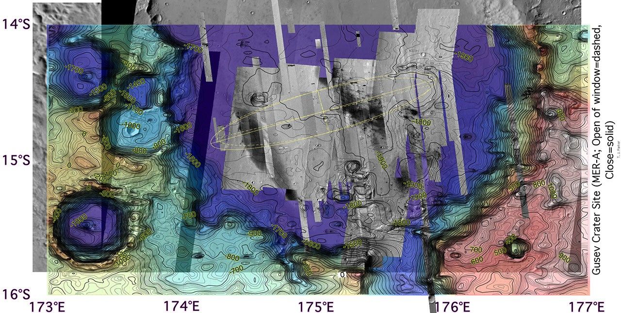 Details of the Gusev Crater designated landing site are added with topographic information and higher-resolution imaging from instruments on the Mars Global Surveyor and Mars Odyssey orbiters.