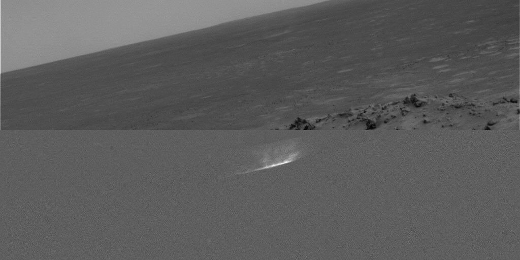 This movie clip shows a dust devil scooting across a plain inside Gusev Crater on Mars as seen from the NASA rover Spirit's hillside vantage point during the rover's 459th martian day, or sol (April 18, 2005). The individual images were taken about 20 seconds apart by Spirit's navigation camera. Each frame in this movie has the raw image on the top half and a processed version in the lower half that enhances contrast and removes stationary objects, producing an image that is uniformly gray except for features that change from frame to frame.