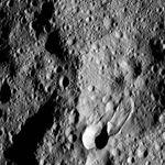 This close-up view of Hakumyi crater, as seen by NASA's Dawn spacecraft, provides insight into the origin of the small crater and lobe-shaped flow next to its southern rim. The sharp edges of these features indicate they are relatively recent with respect to the more subdued Hakumyi, which is 43 miles (70 kilometers) wide. The lobate flow ends in a tongue-shaped deposit. A more discrete feature slightly west (left) of the large lobe-shaped flow suggests an ancient or partially developed lobe.