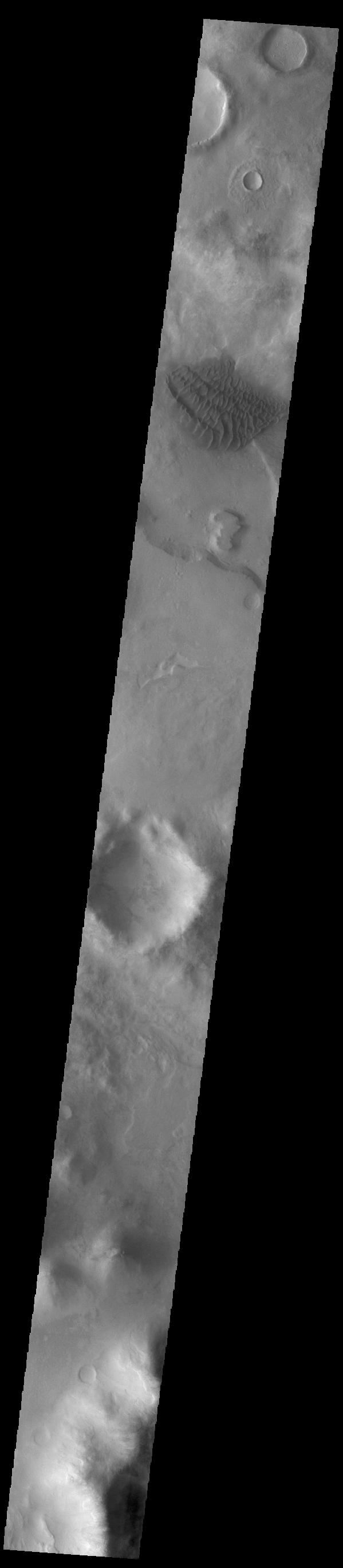 This VIS image shows the dune field on the floor of Halley Crater. Rather than small individual sand dunes, the sand here is collected into a sand sheet and dune forms have been created on that surface. Halley Crater is located on the western margin of Argyre Planitia.