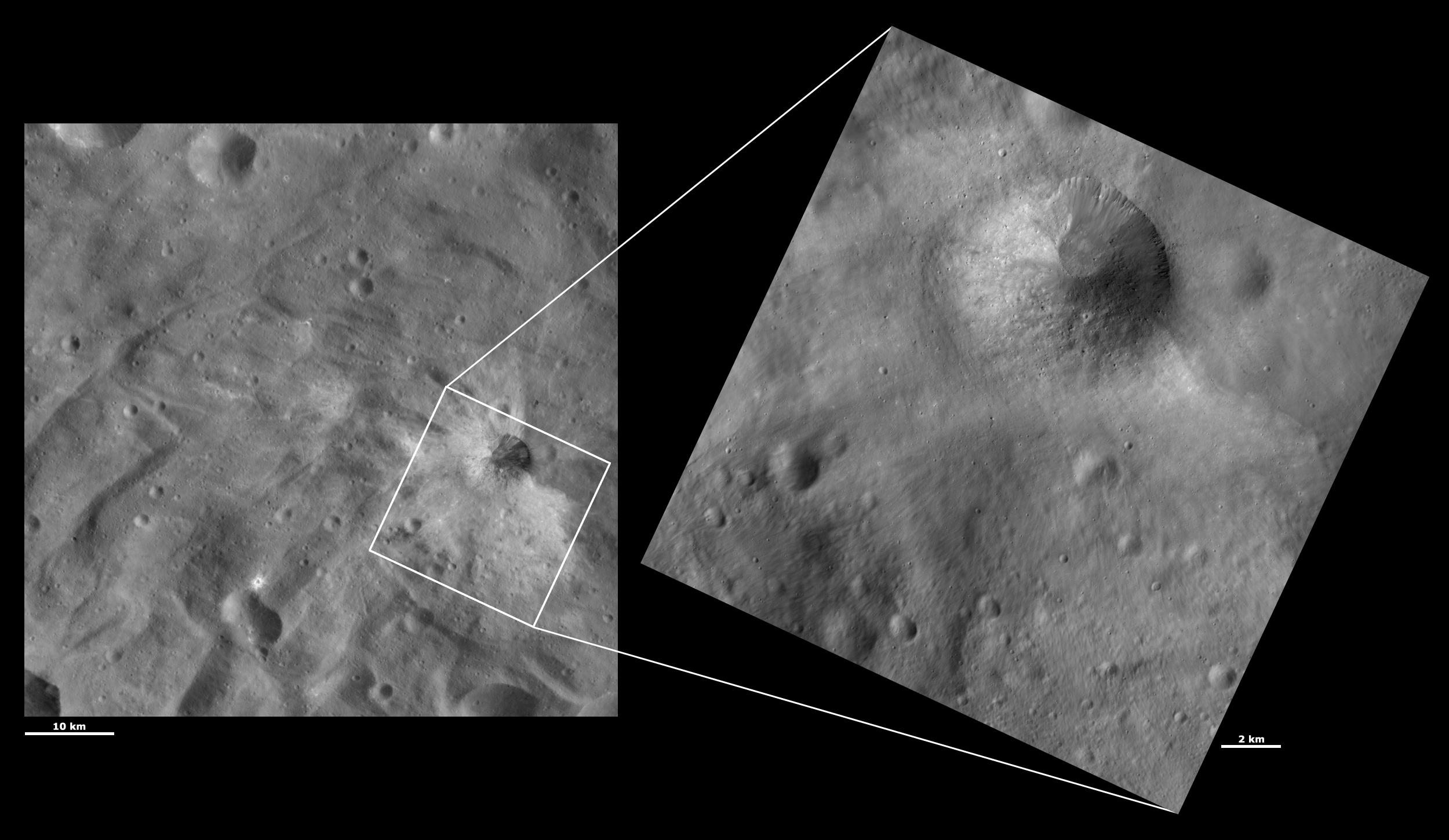 These images are located in Vesta's Urbinia quadrangle, in Vesta's southern hemisphere. NASA's Dawn spacecraft obtained the left image with its framing camera on Oct. 22, 2011. This image was taken through the camera's clear filter. The distance to the surface of Vesta is 700 kilometers (435 miles) and the image has a resolution of about 65 meters (213 feet) per pixel. This image was acquired during the HAMO (high-altitude mapping orbit) phase of the mission. NASA's Dawn spacecraft obtained the right image with its framing camera on Dec. 27, 2011. This image was taken through the camera's clear filter. The distance to the surface of Vesta is 272 kilometers (169 miles) and the image has a resolution of about 19 meters (62 feet) per pixel. This image was acquired during the LAMO (low-altitude mapping orbit) phase of the mission.