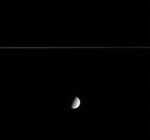 This Cassini image shows Saturn's crater-covered moon Tethys as it slid silently along in its orbit while Saturn's delicate rings sliced the view in two. Tethys is 1,071 kilometers (665 miles) across.