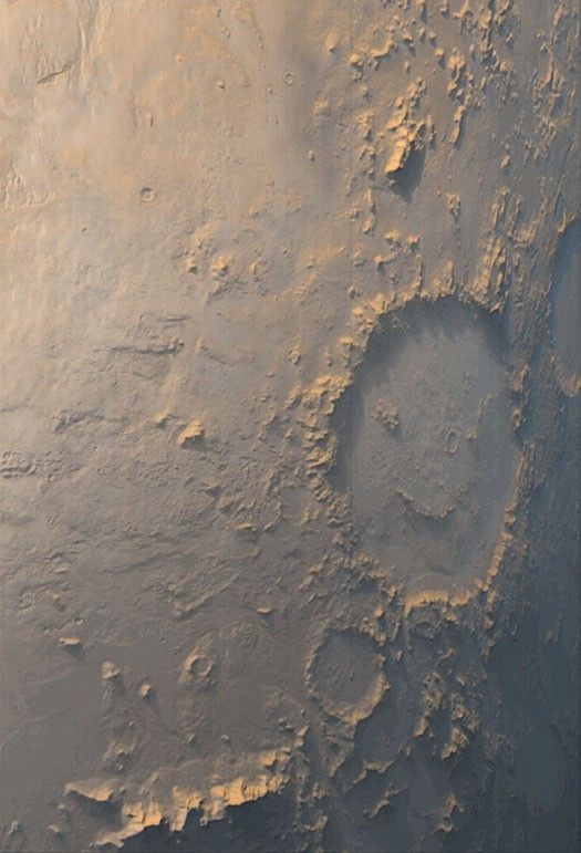 The story of the Mars Orbiter Camera (MOC) onboard the Mars Global Surveyor (MGS) spacecraft began with a proposal to NASA in 1985. The first MOC flew on Mars Observer, a spacecraft that was lost before it reached the red planet in 1993. Now, after 14 years of effort, a MOC has finally been placed in the desired mapping orbit. The MOC team's happiness is perhaps best expressed by the planet Mars itself. On the first day of the Mapping Phase of the MGS mission -- during the second week of March 1999 -- MOC was greeted with this view of "Happy Face Crater" (center right) smiling back at the camera from its location on the east side of Argyre Planitia. This crater is officially known as Galle Crater, and it is about 215 kilometers (134 miles) across. The picture was taken by the MOC's red and blue wide angle cameras. The bluish-white tone is caused by wintertime frost. Illumination is from the upper left. For more information and Viking Orbiter views of "Happy Face Crater," see http://www.msss.com/education/happy_face/happy_face.html.
