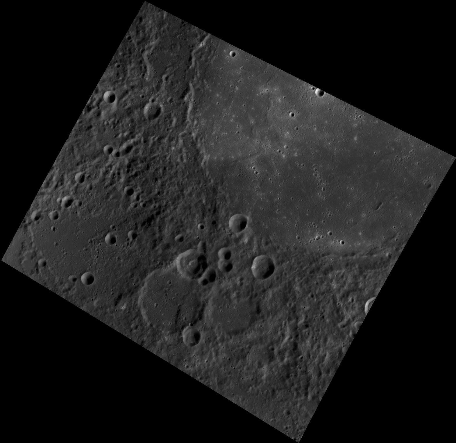This image, taken with the Wide Angle Camera (WAC), shows a portion of Copland crater and its ejecta blanket. Copland crater is flooded with volcanic material, giving it a smooth appearance. The crater was named for Aaron Copland, the 20th century American composer and conductor whose ballet score Appalachian Spring popularized the Shaker melody Simple Gifts.