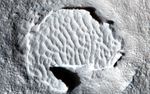 Nevertheless, other Martian dunes are clearly *inactive*. This image in Arcadia Planitia shows dunes in a crater. Unlike active dunes on the planet, those here are bright, and, zooming in, there are several lines of evidence indicating that the dunes have become indurated, that is, hardened into cohesive sediment or even into sandstone rock. For example, the dune field at the southern edge is cut off by a step cliff, indicating erosion of hard material. Although fine scale ripples on the original dune surface are preserved, we also see large scale fluting from southwest to northeast, a common texture associated with wind-induced sand abrasion.