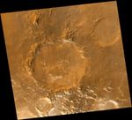 Smile! Spring has sprung in the martian southern hemisphere. With it comes the annual retreat of the winter polar frost cap. This view of "Happy Face Crater"--officially named "Galle Crater"--shows patches of white water ice frost in and around the crater's south-facing slopes. Slopes that face south will retain frost longer than north-facing slopes because they do not receive as much sunlight in early spring. This picture is a composite of images taken by the Mars Global Surveyor Mars Orbiter Camera (MOC) red and blue wide angle cameras. The wide angle cameras were designed to monitor the changing weather, frost, and wind patterns on Mars. Galle Crater is located on the east rim of the Argyre Basin and is about 215 kilometers (134 miles) across. In this picture, illumination is from the upper left and north is up.