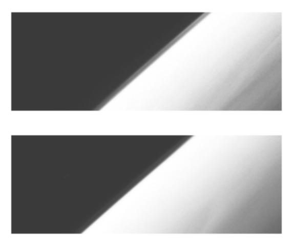 These images show the apparent edge (limb) of the planet Jupiter as seen through both the violet filter (top frame) and an infrared filter (756 nanometers, bottom frame) of the Solid State Imaging (CCD) system aboard NASA's Galileo spacecraft. North is to the top of the picture. A separate haze layer is clearly visible above the northern part of the limb.