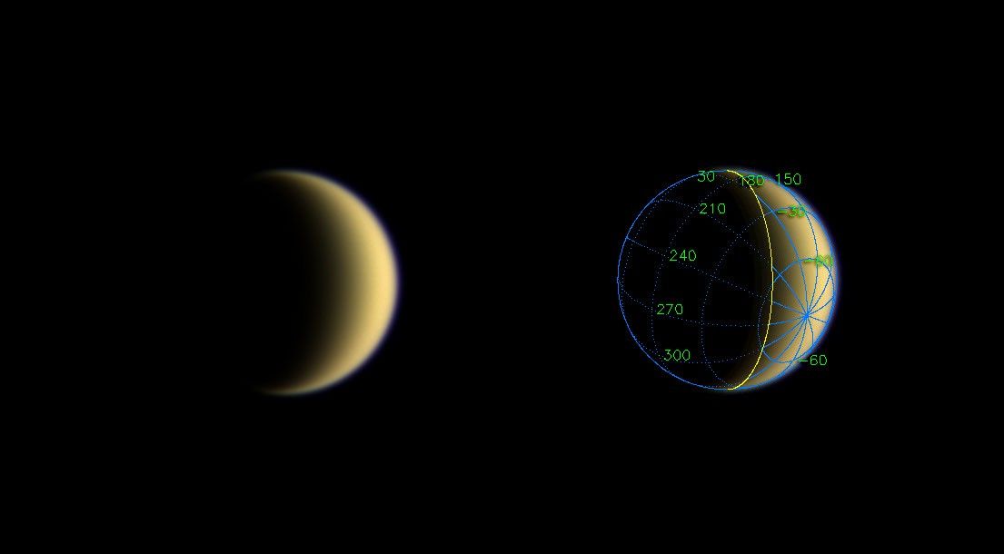 The superimposed coordinate system grid in the accompanying image at right illustrates the geographical regions of the moon that are illuminated and visible, as well as the orientation of Titan -- lines of longitude converge on the South Pole near the moon's eastern limb. The yellow curve marks the position of the boundary between day and night on Titan.