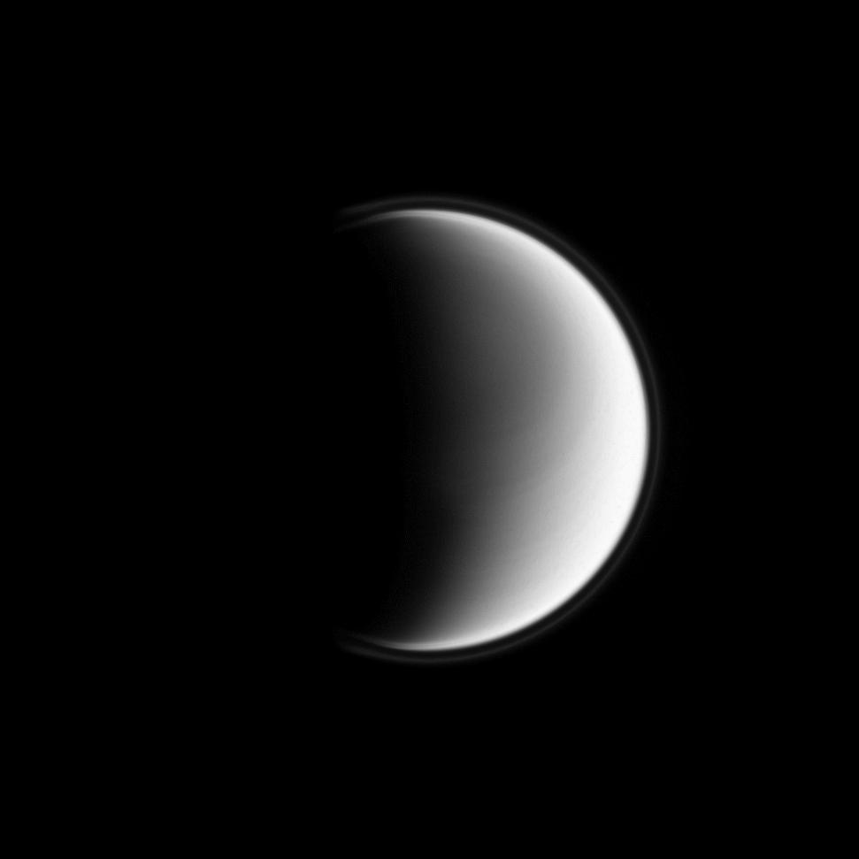 The Cassini spacecraft reveals Titan's upper-most atmospheric hazes, creating the appearance of a halo around Saturn's largest moon.