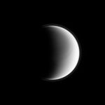 Most of the lit terrain seen here is on the anti-Saturn side of Titan (5150 kilometers, or 3200 miles across). The image was taken in visible violet light with the Cassini spacecraft wide-angle camera on March 27, 2009. The view was acquired at a distance of approximately 196,000 kilometers (122,000 miles) from Titan and at a Sun-Titan-spacecraft, or phase, angle of 106 degrees. Image scale is 12 kilometers (7 miles) per pixel.