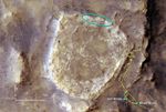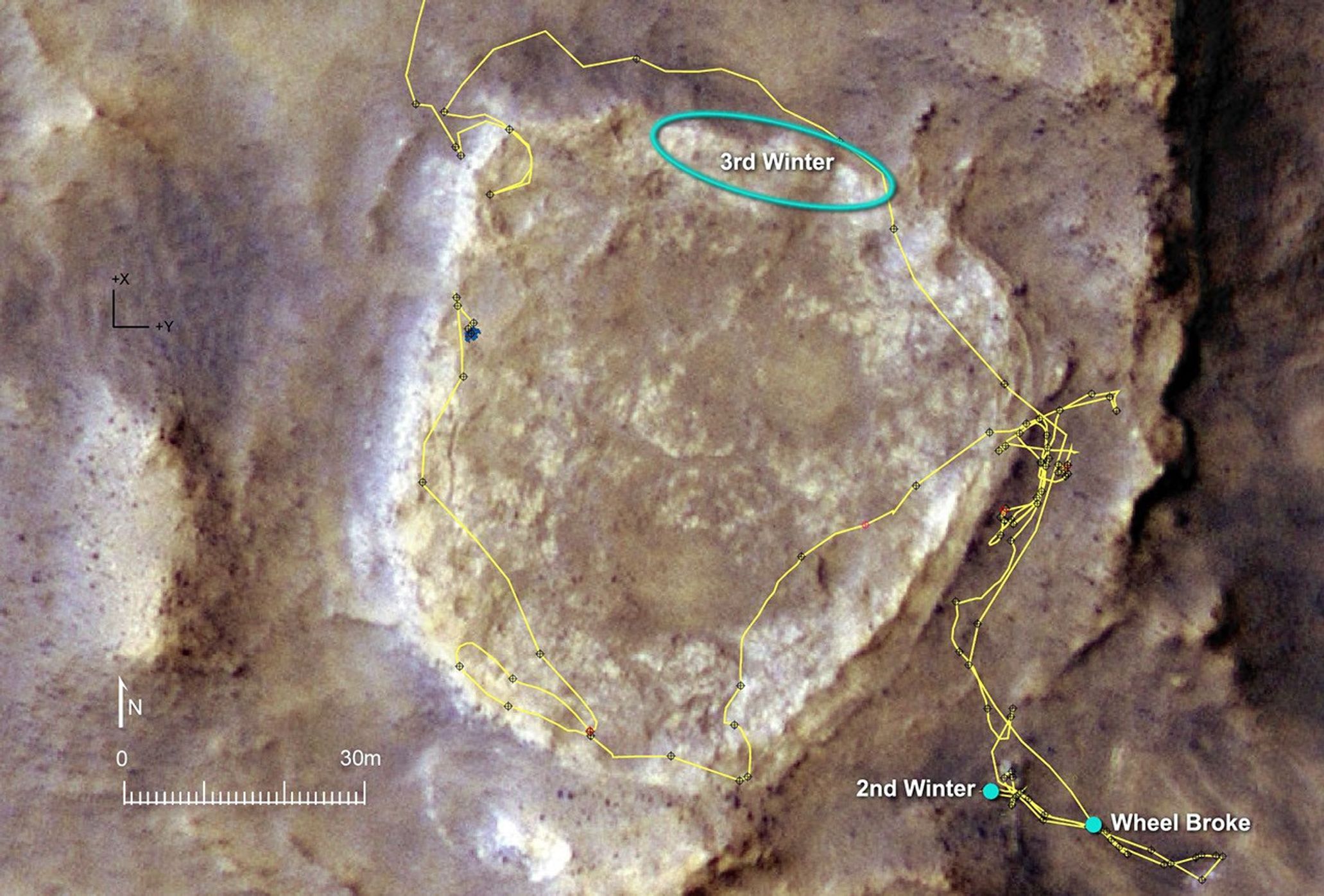 The yellow line on this map of the Home Plate area indicates Spirit's route from early February 2006, entering the mapped area from the north (top), to late November 2007, on the western edge of the bright-toned Home Plate plateau. The map covers an area about 160 meters (525 feet) across from west to east. Labels indicate the area intended for Spirit to spend many months spanning the rover's third Martian winter, the site where it spent about seven months (April to November 2006) spanning its second winter, and the site where it lost use of the drive motor for one of its six wheels.
