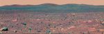 This enhanced false-color mosaic image from the Mars Exploration Rover Spirit panoramic camera shows the view acquired after the rover drove approximately 50.2 meters (165 feet) on the martian afternoon of sol 89 (April 3, 2004). The view shows the direction of the rover's future drive destination. In the distance are the eastern-lying "Columbia Hills." This image was assembled from images in the panoramic camera's near-infrared (750 nanometer), green (530 nanometer), and violet (432 nanometer) filters. The colors have been exaggerated to enhance the differences between cleaner and dustier rocks, and lighter and darker soils.