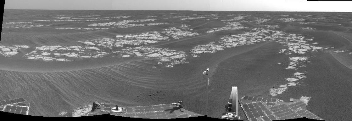 NASA's Mars Exploration Rover Opportunity is currently traveling southward over a pavement of outcrop dubbed the "Erebus Highway." "Erebus Crater," the rover's next target, lies less than 100 meters (328 feet) south of its current position. This view is a mosaic produced from from frames taken by the rover's navigation camera during Opportunity's 582nd martian day, or sol (Sept. 13, 2005). It shows fractured blocks of ancient sedimentary rock separated by recent sand dunes. Mars Exploration Rover team scientists are investigating both the composition of the rocks and the processes by which the distinctive fracture pattern arose.