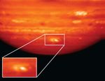This infrared image, showing thermal radiation at a wavelength of 9.7 microns, was obtained by the Gemini North Telescope in Hawaii. The image shows the aftermath of an impactor hitting Jupiter on July 19, 2009. The area of impact can be seen as the bright white and yellow features at the bottom of this image. An inset shows the impact area in more detail. The image was taken on July 22, 2009, three days after the impact. White and yellow indicate hot temperatures and the presence of hot ammonia upwelling from deep in Jupiter's atmosphere. Infrared images like this, along with measurements of light intensity at different wavelengths to look for the unique signatures of different materials that were obtained by the Gemini South Telescope in Chile, strongly suggest to scientists that a rocky body slammed into the Jovian atmosphere. That body was likely an asteroid and not a comet.