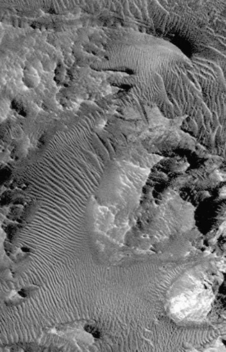 Complex variations in dune forms within Hebes Chasma. This southern subframe image, frame 3506, is a 2.3 x 3.6 km area centered near 0.8 degrees south, 76.3 degrees west