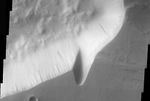 Dust avalanches, also called slope streaks, occur on many Martian terrains. The deposition of airborne dust on surfaces causes a bright tone in the THEMIS VIS images. Any movement of the dust downhill, a dust avalanche, will leave behind a streak where the darker, dust-free surface is exposed.