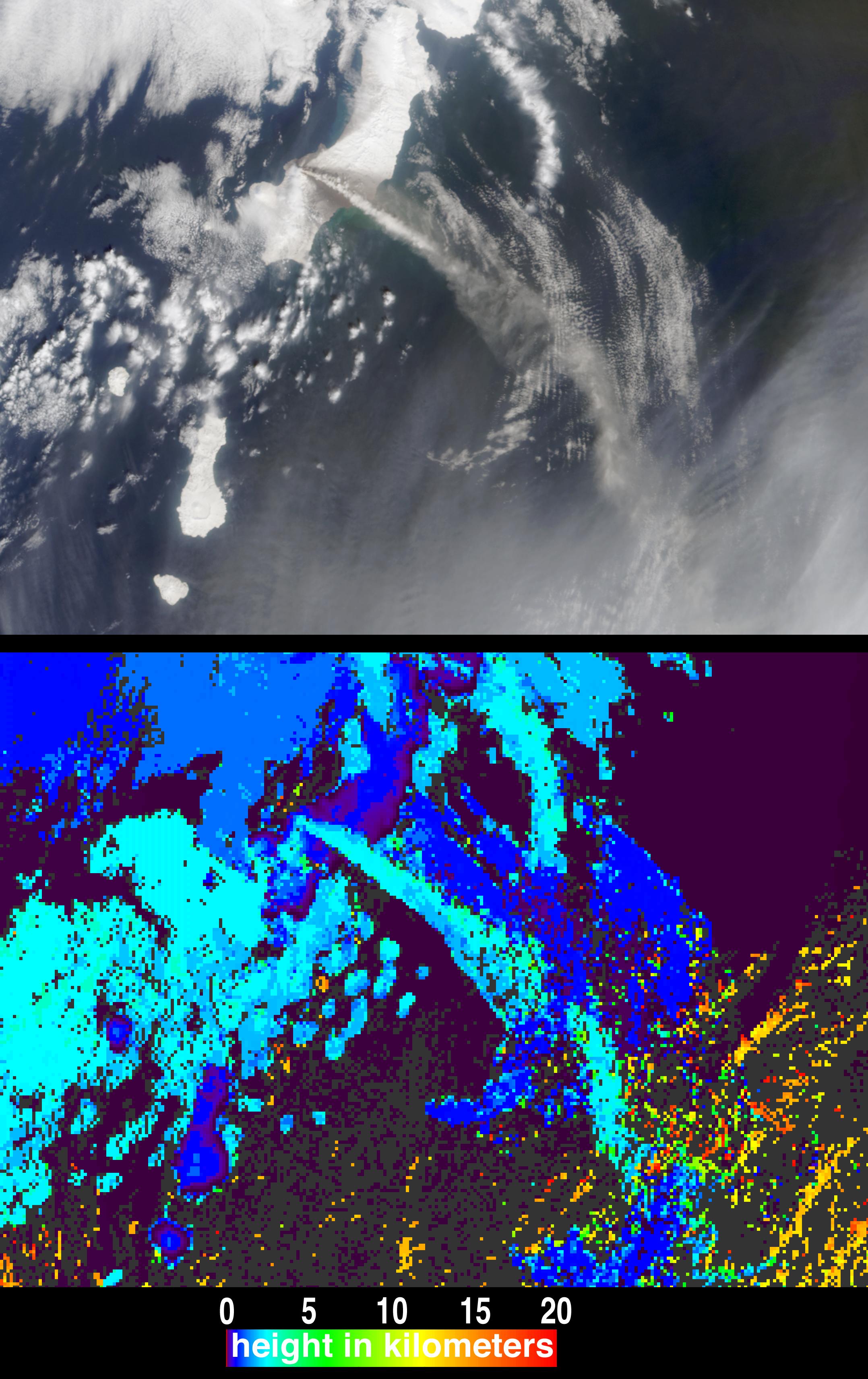 The lower panel shows heights derived from automated stereoscopic processing of MISR's multi-angle imagery, in which the plume is determined to reach heights of about 2.5 kilometers above sea level. Heights for clouds above and below the eruption plume were also retrieved, including the high-altitude cirrus clouds in the lower left (orange pixels). The distinctive patterns of these features provide sufficient spatial contrast for MISR's stereo height retrieval to perform automated feature matching between the images acquired at different view angles. Places where clouds or other factors precluded a height retrieval are shown in dark gray.