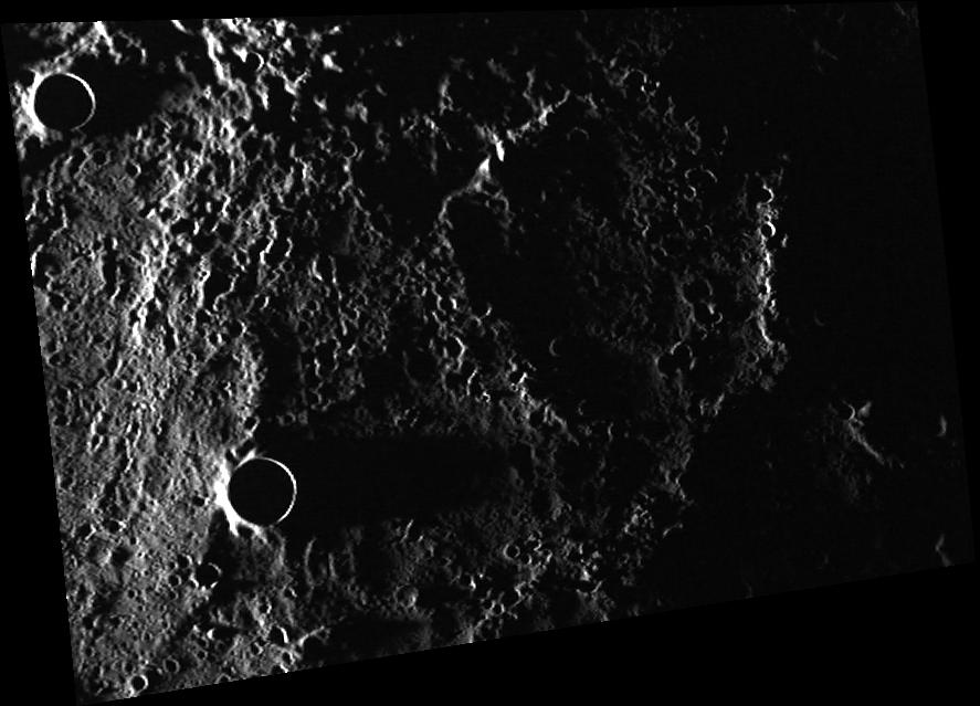 This image extends from about 86 to 88 degrees North. Most of the area is in darkness since the Sun is barely above the horizon at this high latitude. The impact crater at the lower left casts a long shadow across the silent, dimly lit landscape. The crater's eastern rim just catches the Sun, forming an illuminated arc.