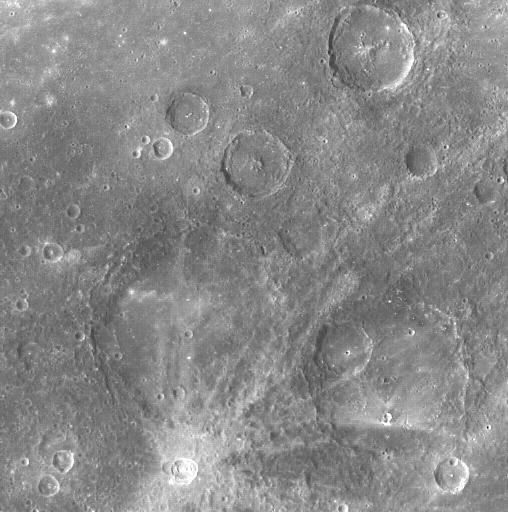 The rayed crater near the bottom of this image is Hodgkins, named in July 2009 in honor of the New Zealand painter Frances Hodgkins (1869-1947). In this image, north is approximately toward the upper right corner. Hodgkins has an asymmetric pattern of rays, which provides information about the impact event that formed the crater. Hodgkins' asymmetric rays were formed when an object, traveling in either a northeastern or southwestern direction, struck Mercury at a low angle to the surface. Compare the rays of Hodgkins to the rays of Qi Baishi and Hovnatanian, and read more about low-angle impacts. Visit this image of Bek to learn more about how rays form and how they fade with time.