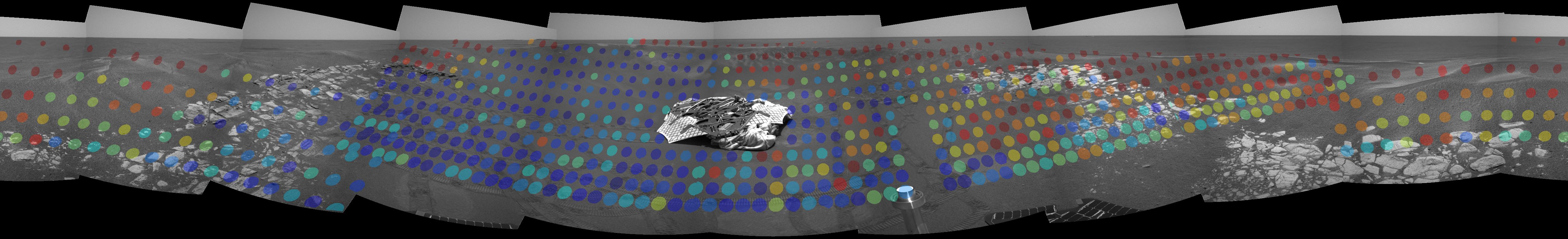 These maps, created with data from the miniature thermal emission spectrometer, an instrument located on the Mars Exploration Rover Opportunity's panoramic camera mast assembly, show the hematite abundance as detected by the instrument from inside the crater at Opportunity's landing site. Hematite data was taken at infrared wavelengths to create these maps, which have been superimposed on images from the rover's navigation camera to provide the visual context of how the hematite is distributed across the martian surface. The hematite abundance has been color-coded, with blue showing relatively no abundance to red showing about 20 percent abundance. Each roughly circular spot represents a single observation by the instrument.