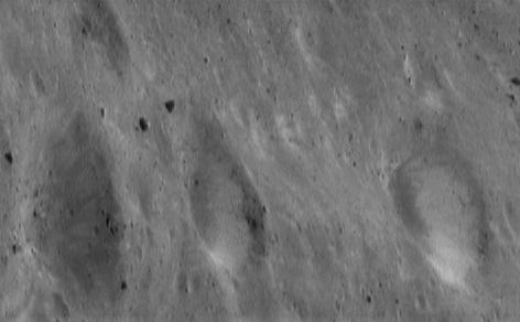 A large volume of images of Eros' surface have been taken in the nearly seven months that NEAR Shoemaker has been orbiting the asteroid. From these pictures, the first good understanding of the surface of an asteroid has begun to emerge. One of the key findings is a variety of brightness features inside Eros' craters. This picture, taken July 22, 2000, from an orbital altitude of 50 kilometers (31 miles), shows three craters, each about 600 meters (2000 feet) in diameter, aligned horizontally in this view across the bottom of the frame. The two craters at the right have well-developed, nearly continuous deposits of brightened regolith. In the crater at the left, more subtle, discrete tongues with elevated brightnesses are barely discernible on the crater wall. With a little imagination, the two craters to the right appear almost like eyeballs peering sideways at their distinctively different neighbor.
